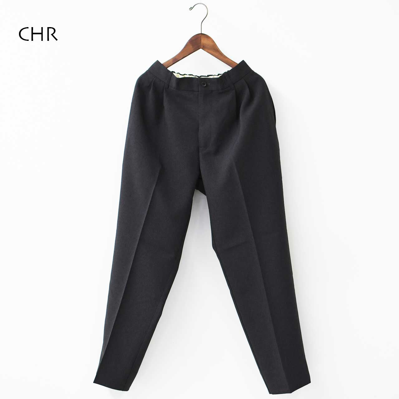 ウエスト後ろ半分はゴム仕様。ツータックを入れて全体に太めのシルエットです。