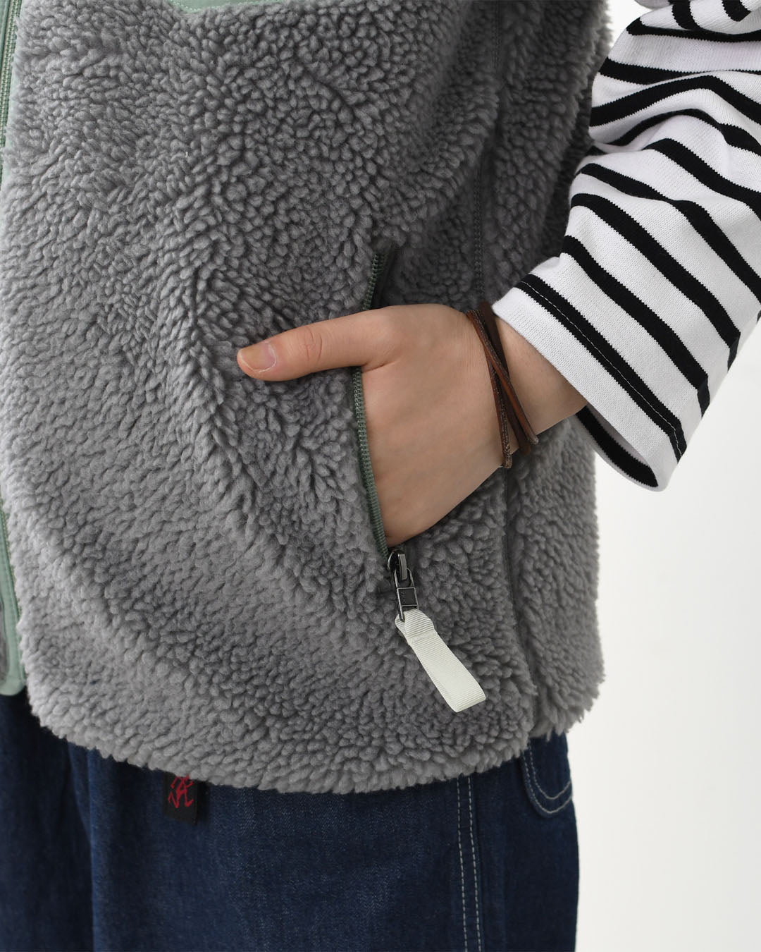 プラスチック汚染の危機にさらされている沿岸部の共同体から供給された、オーシャンサイクルの認証済みのリプリーブ・リサイクル・ポリエステル100%の6ミリ厚パイル・フリースで作ったソフトで温かい防風性ベスト。裏地はリサイクル・ポリエステル100%のタフタで、PFASを意図的に使用せずに製造されたDWR(耐久性撥水)加工済み