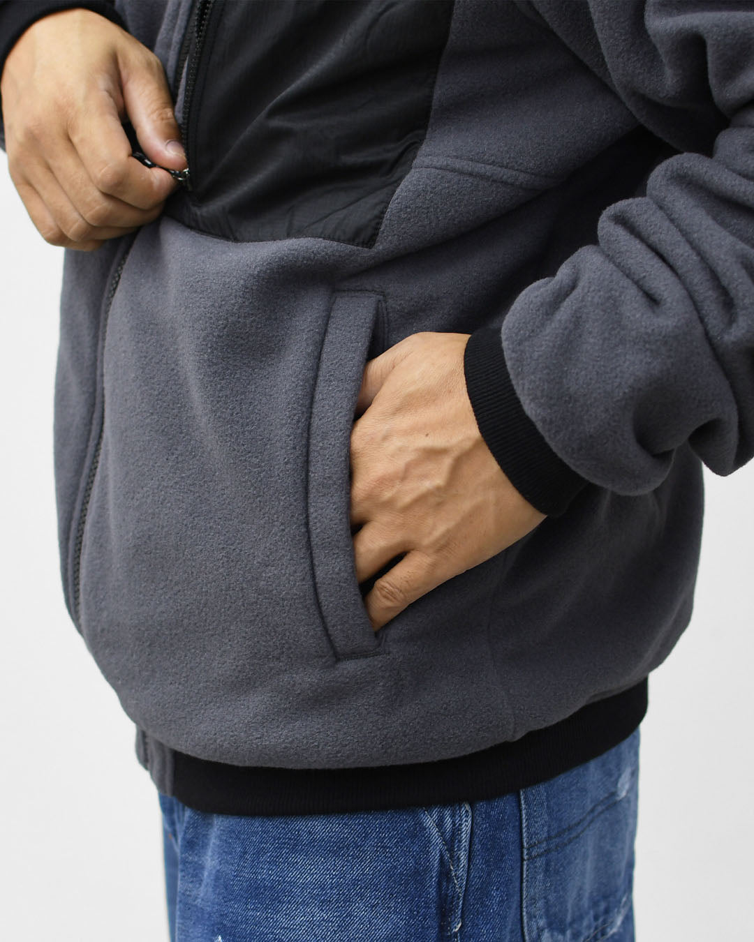 リサイクル・ポリエステル100%の起毛フリースを使用した裏面にはハンドウォーマーポケットが2つと、左胸にジッパー式パッチ型ポケットが1つ