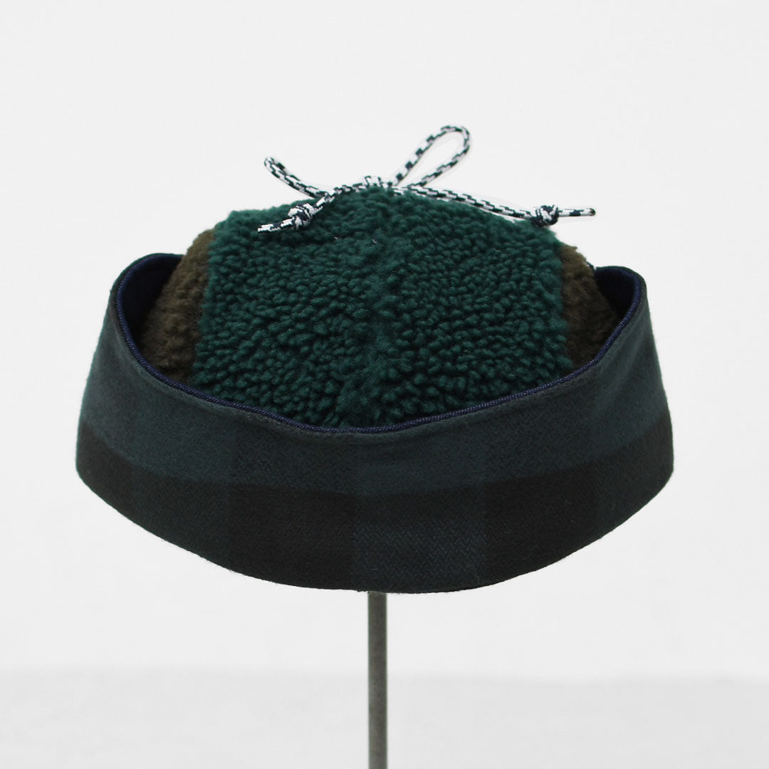 状況に合わせて上げても下げても使用可能なイヤーフラップ付きで、頭頂部の外側の素材はデニム、フリース、プレードから選べ、3つのサイズでご用意。