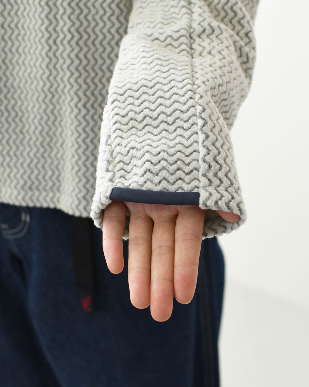 本体はリサイクル・ポリエステル100%素材の中空糸を使用したジャカード・フリースで、冷涼な天候下のアクティビティに吸湿発散性と速乾性と優れた通気性を提供