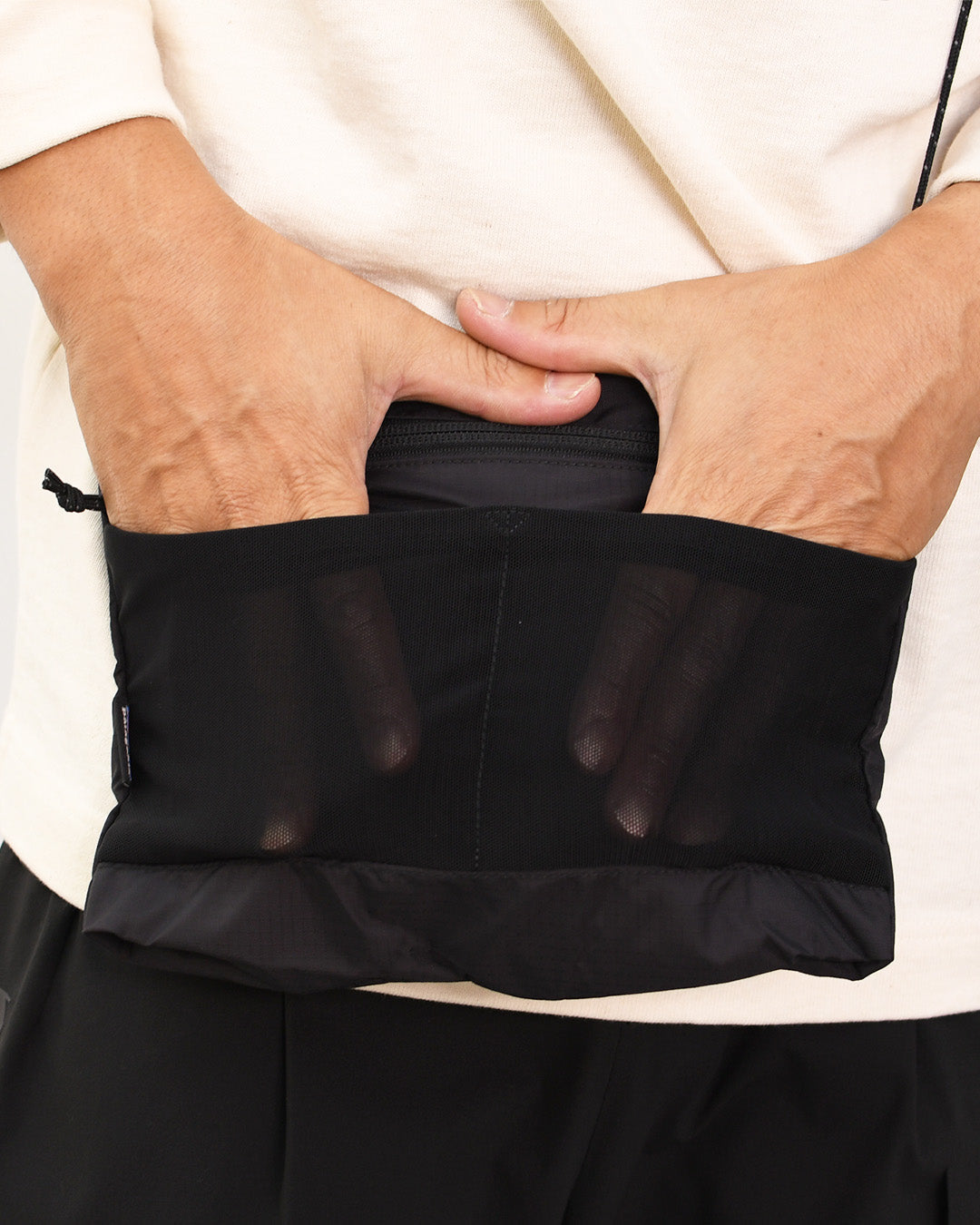 軽量な速乾性素材で作ったこの小型ポーチは、調節可能な長いストラップで体の前にも斜めにもかけて運べ、アクセスしやすいポケット付き。