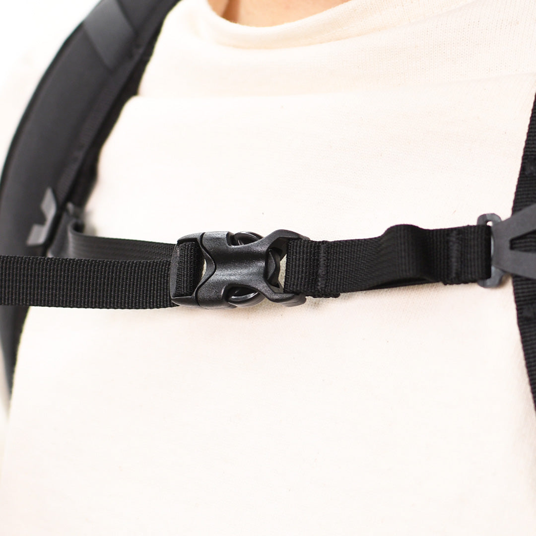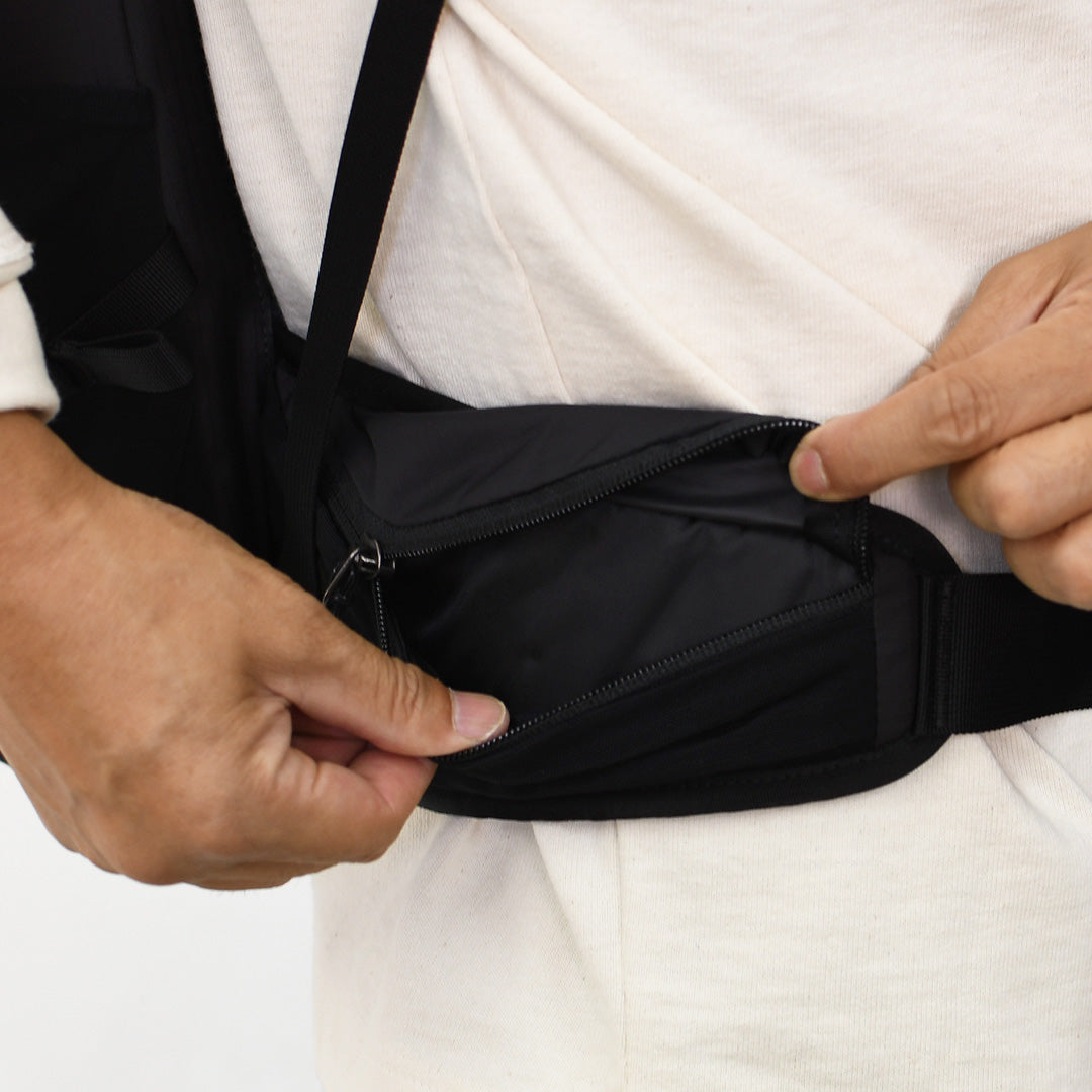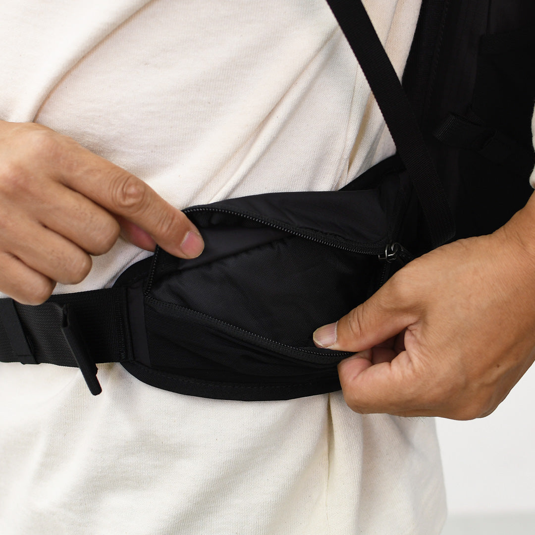 内側に闇パック用スリーブを備え、ショルダーストラップの中間に施した小穴にチューブを通すことで左右どちらの肩にも対応。 両脇のポケットにはフルサイズのウォーターボトルも収納可能