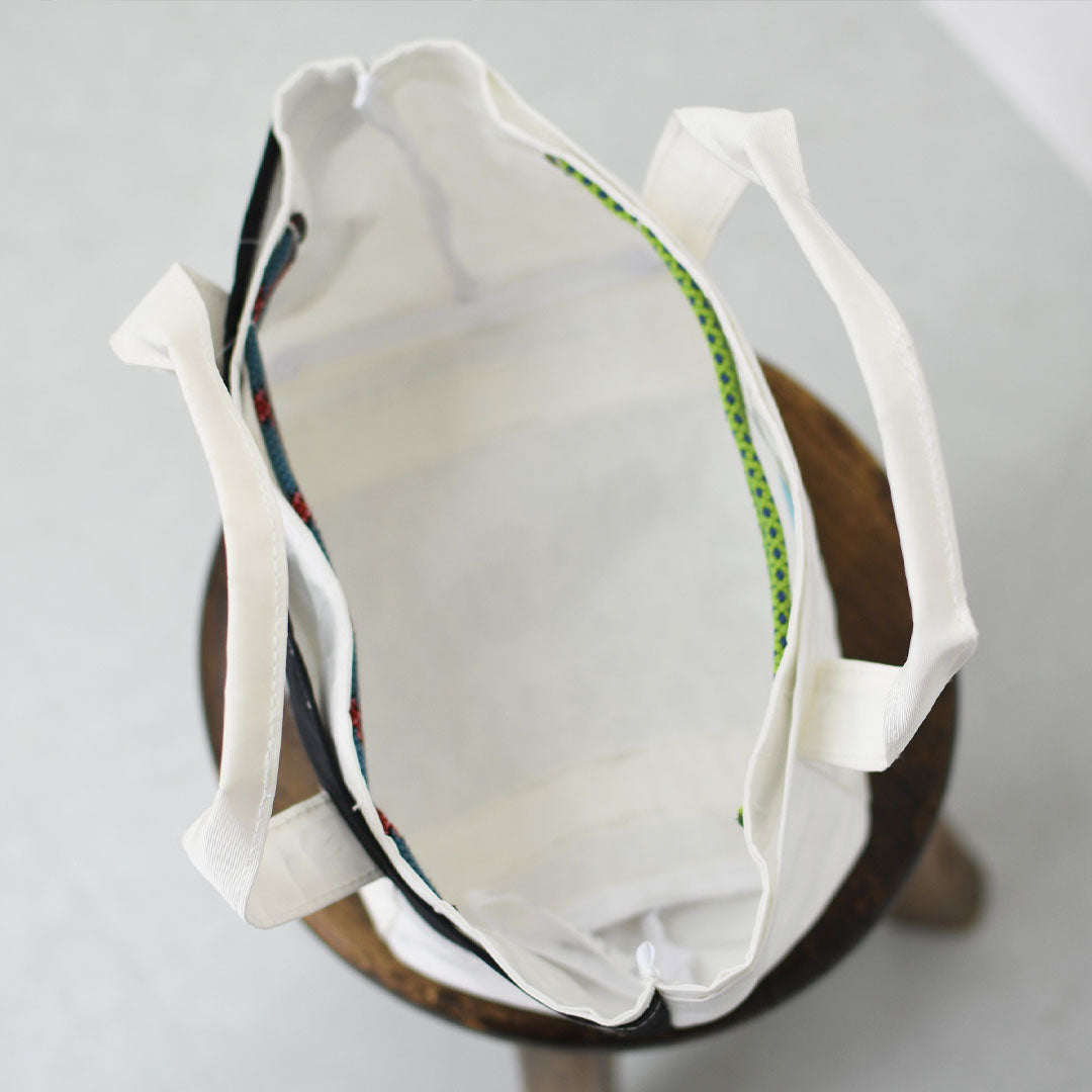 収納力ばつぐんのミニトート。マチ幅約16.5cmなので幅のあるものもすっぽり入ります。ポケット6個で細かいものも収納可。着古したパタゴニアのジャケットや古い帆、クライミングロープなどを再利用
