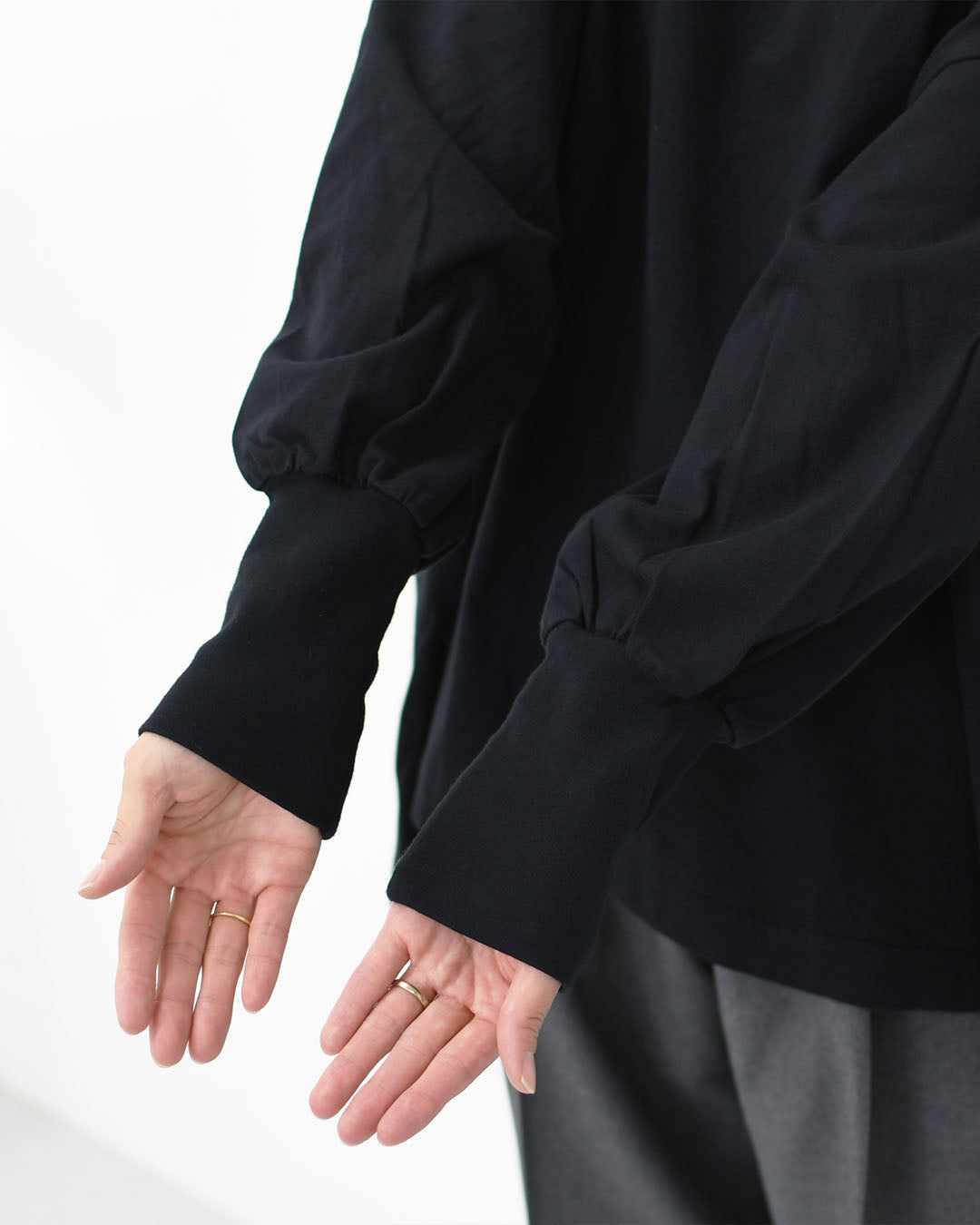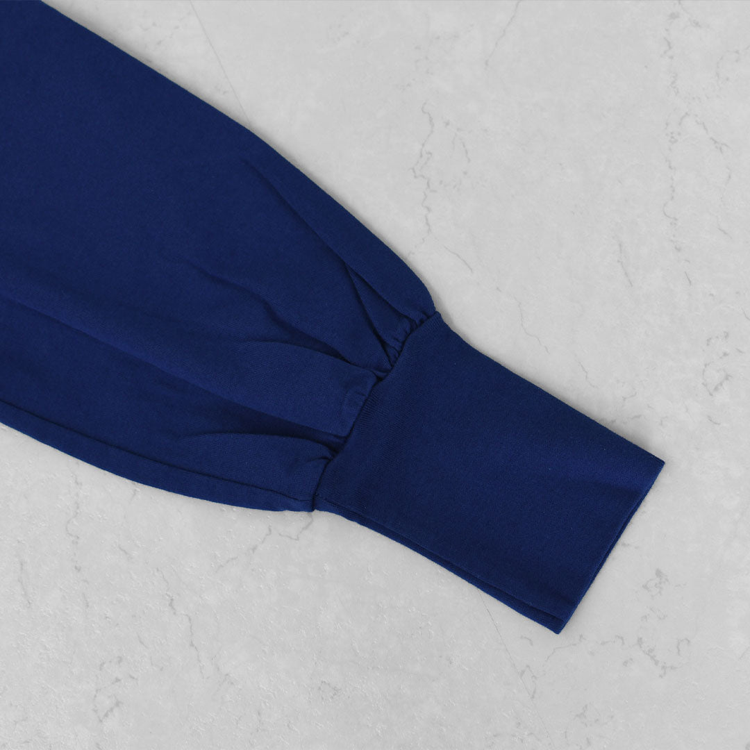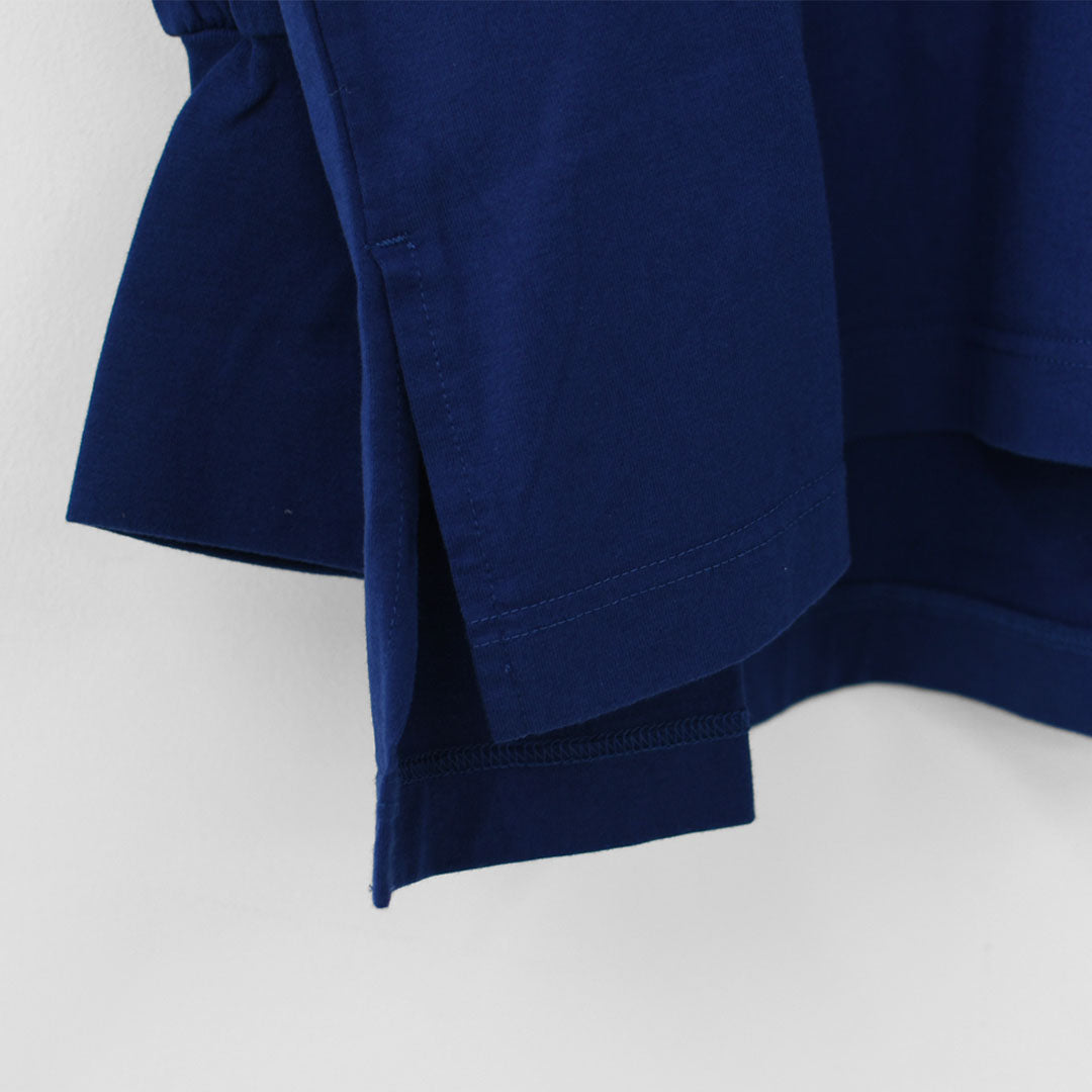 ネックと袖口は見頃と同じ糸を使ったフライス使いで、やわらかく伸縮性があり着やすくなっています。