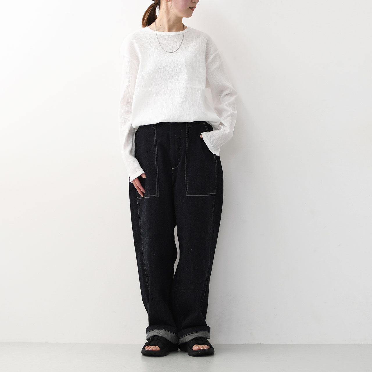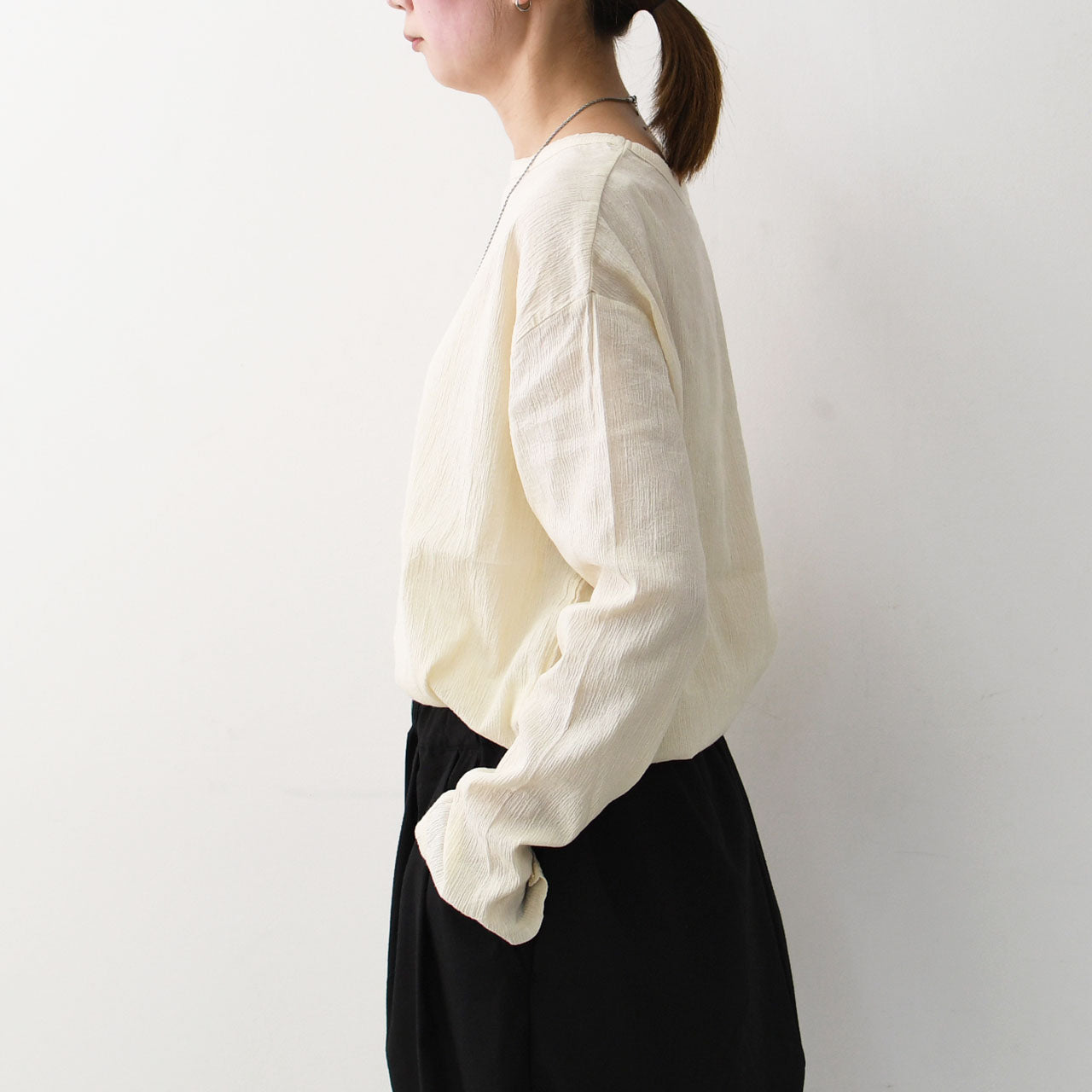 シンプルな中に女性らしいやわらかさを添えてくれます。ボトムインもアウトも決まる、万能なバランス感です。