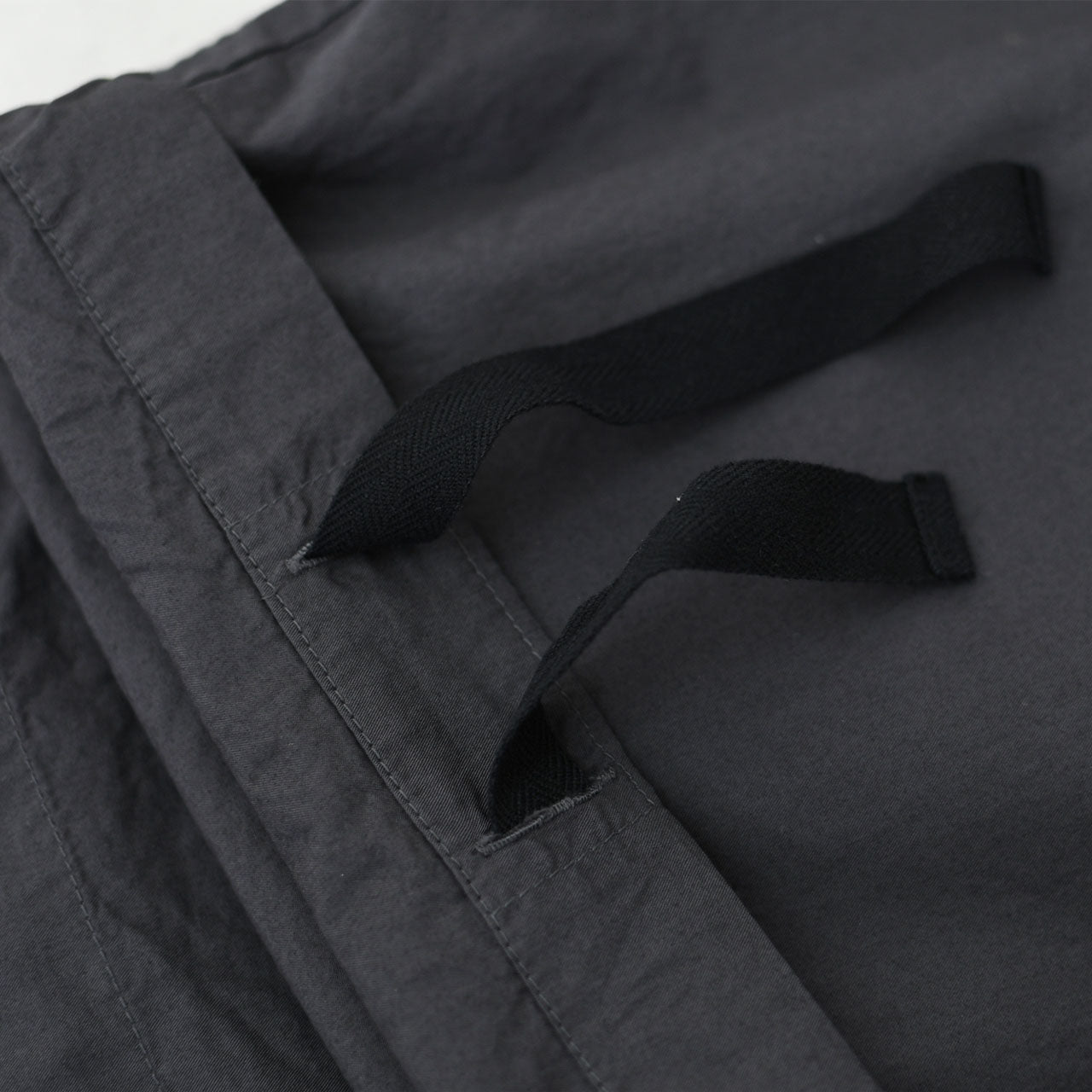 通常ではワイドめなストレートシルエットですが、裾ヒモを絞ることで少し細めのテーパードシルエットに変化します。