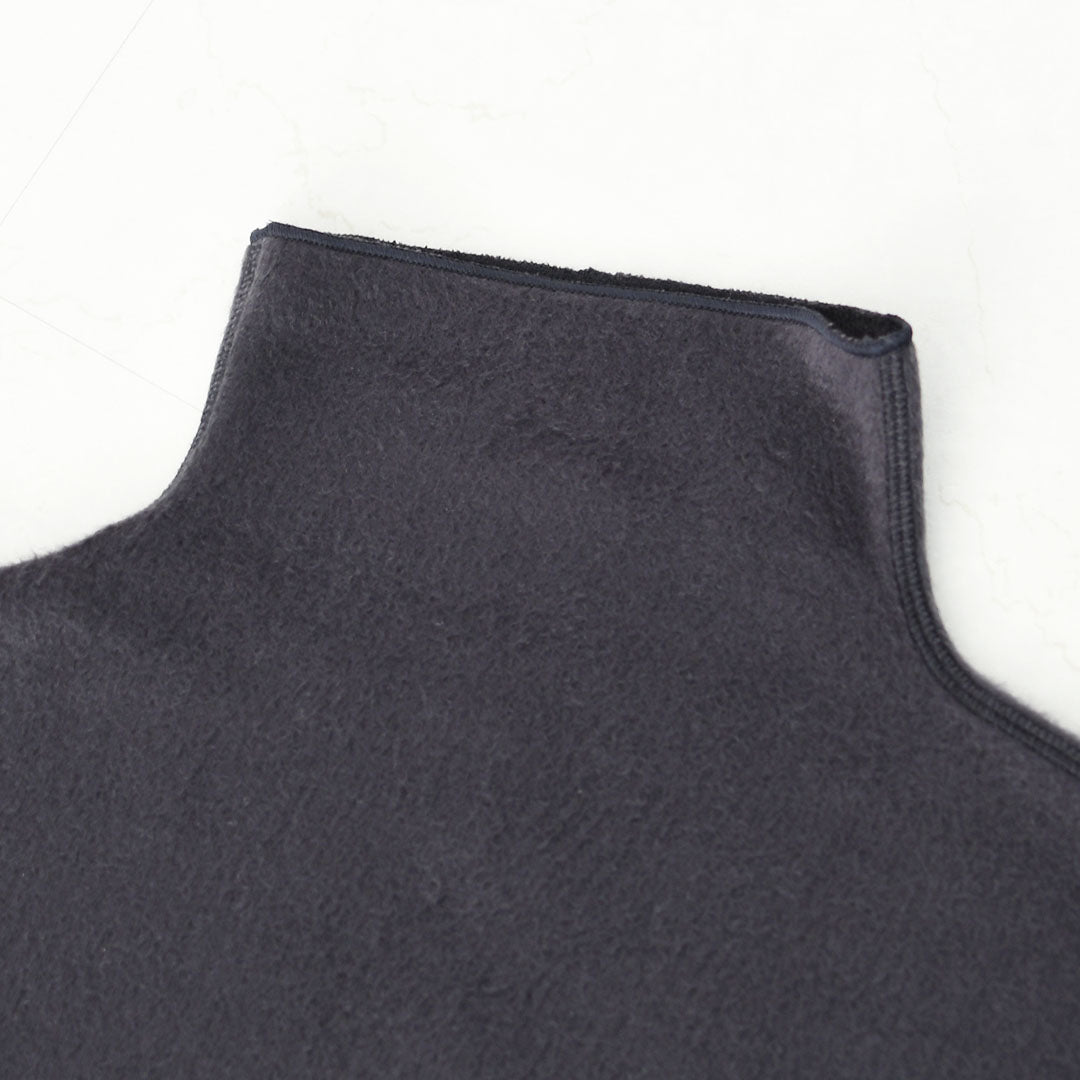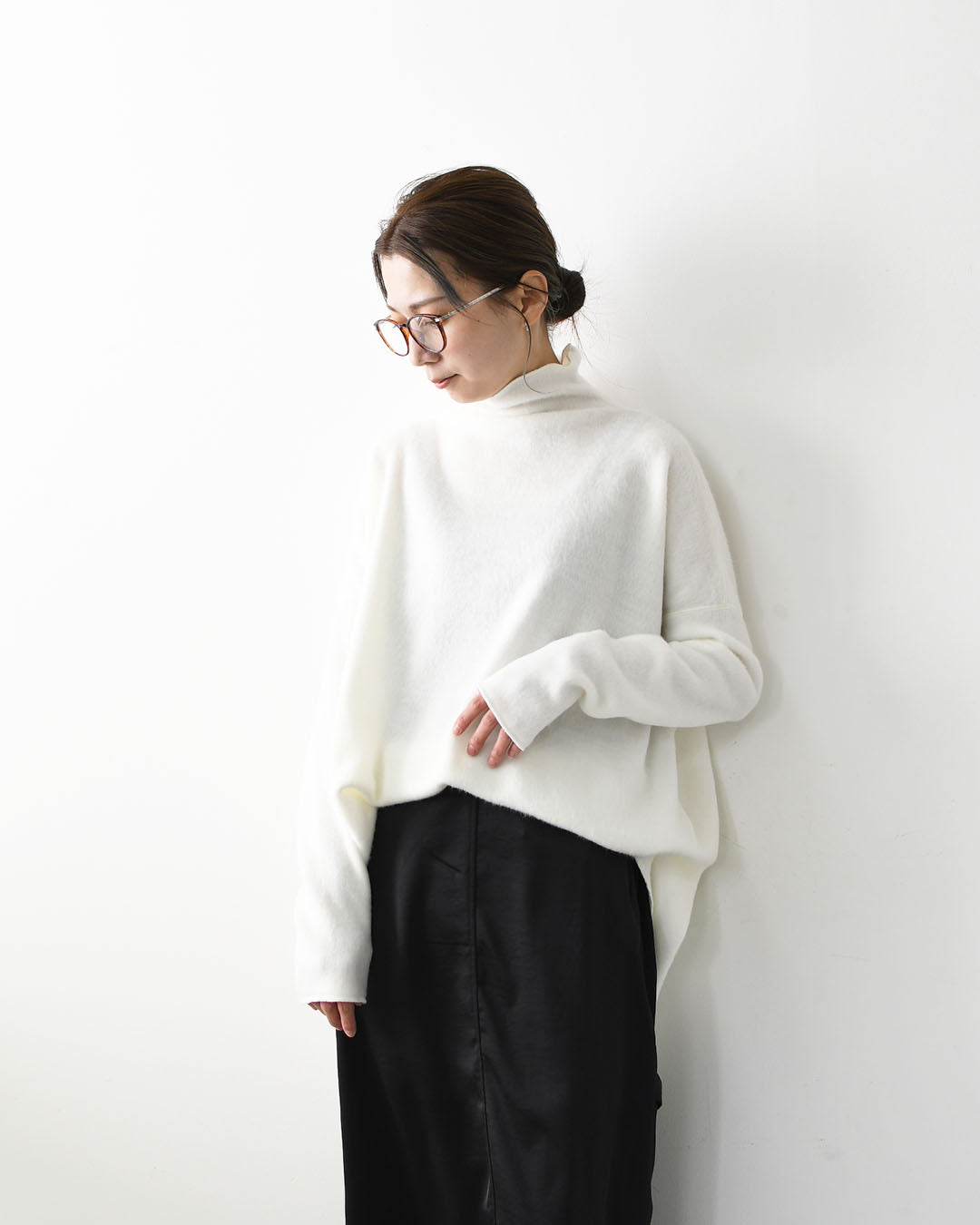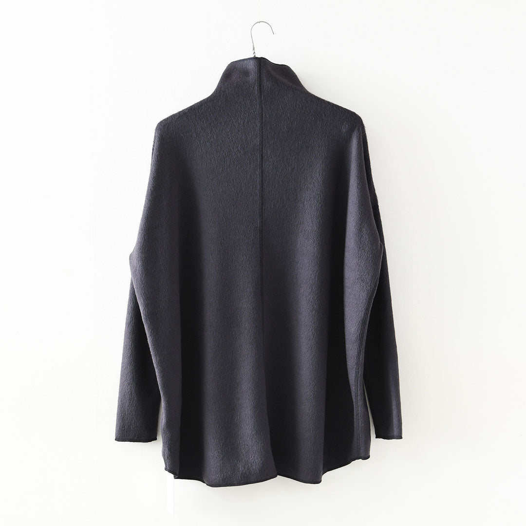 首元のハイネックは程よく立ち上がり、優しくカバーしつつも窮屈さはなく、軽やかに顔周りを見せてくれます。
