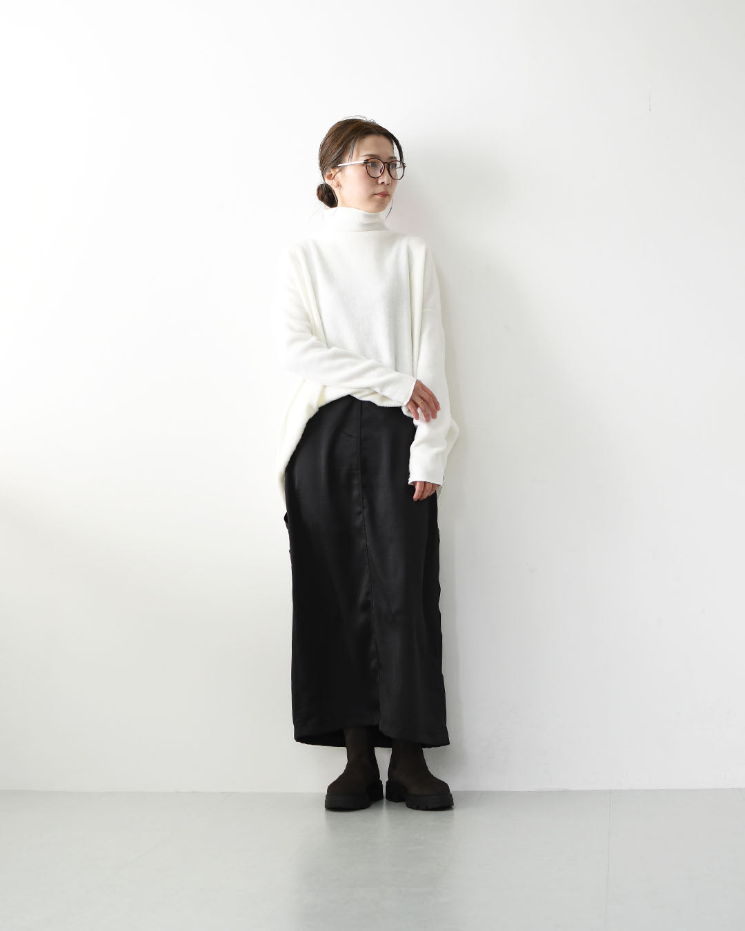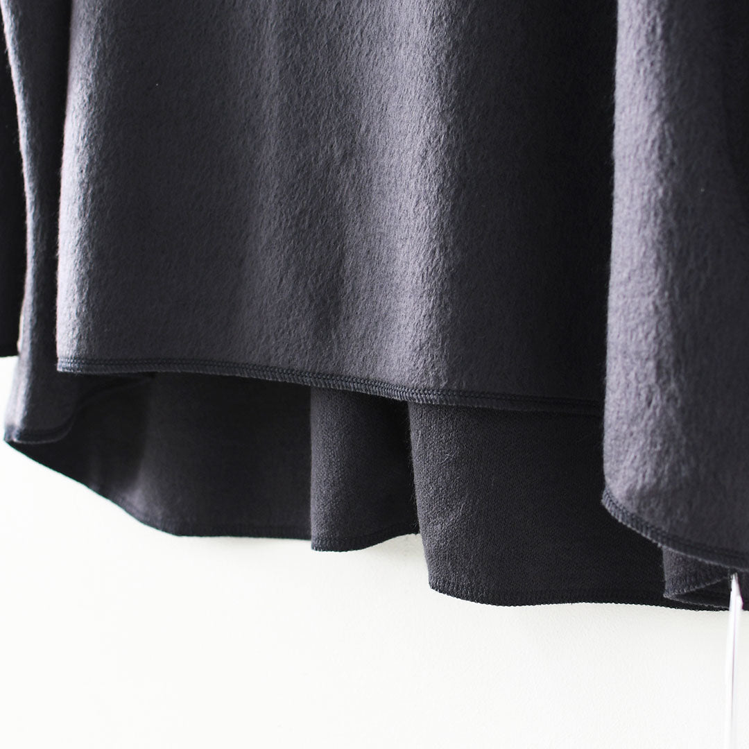 ゆったりとしたワイドシルエットは体のラインを拾わず、リラックスした印象ながら上品さも併せ持ちます。