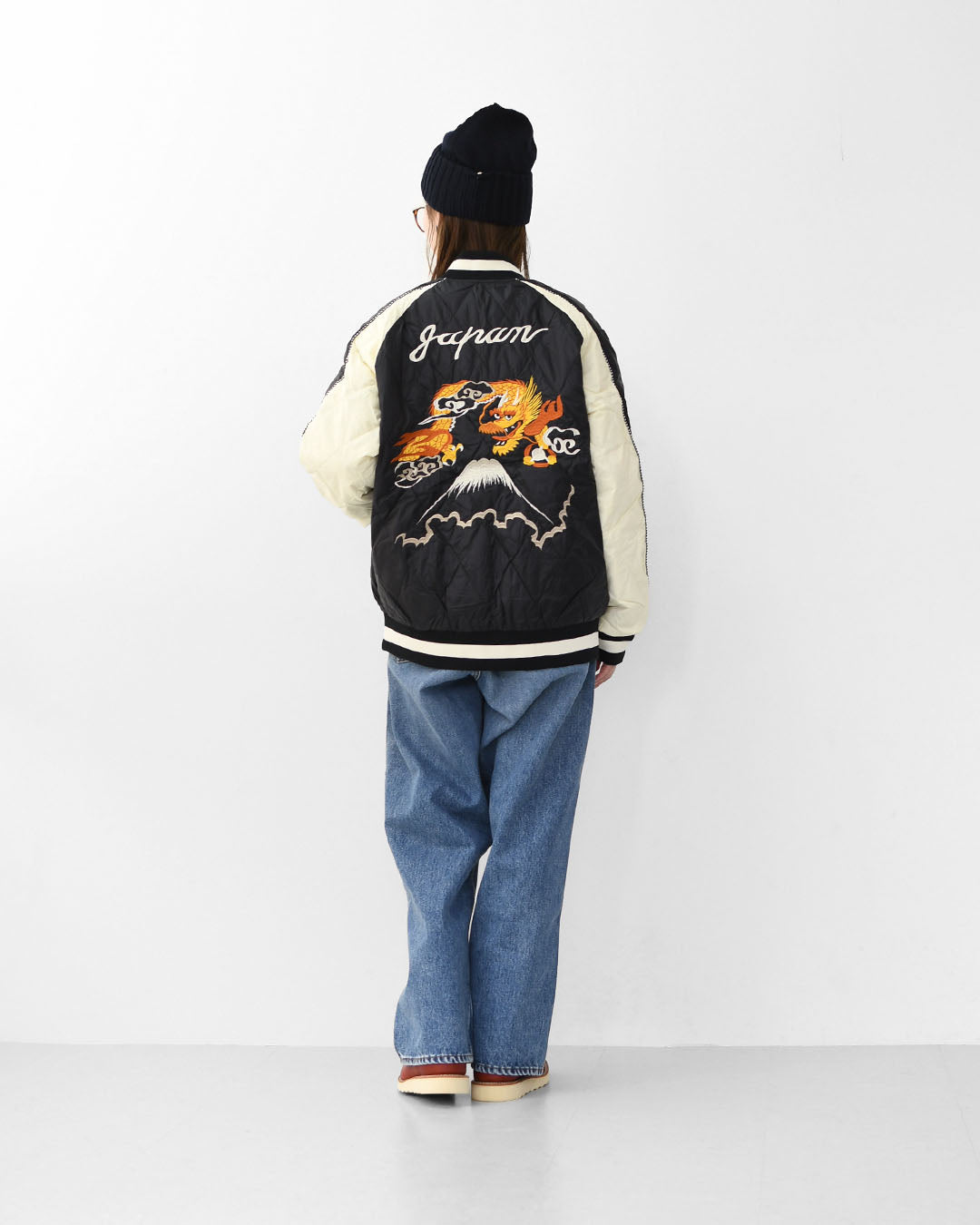 スカジャンとダウンを組み合わせた、スカジャン風リバーシブルダウンジャケット。
