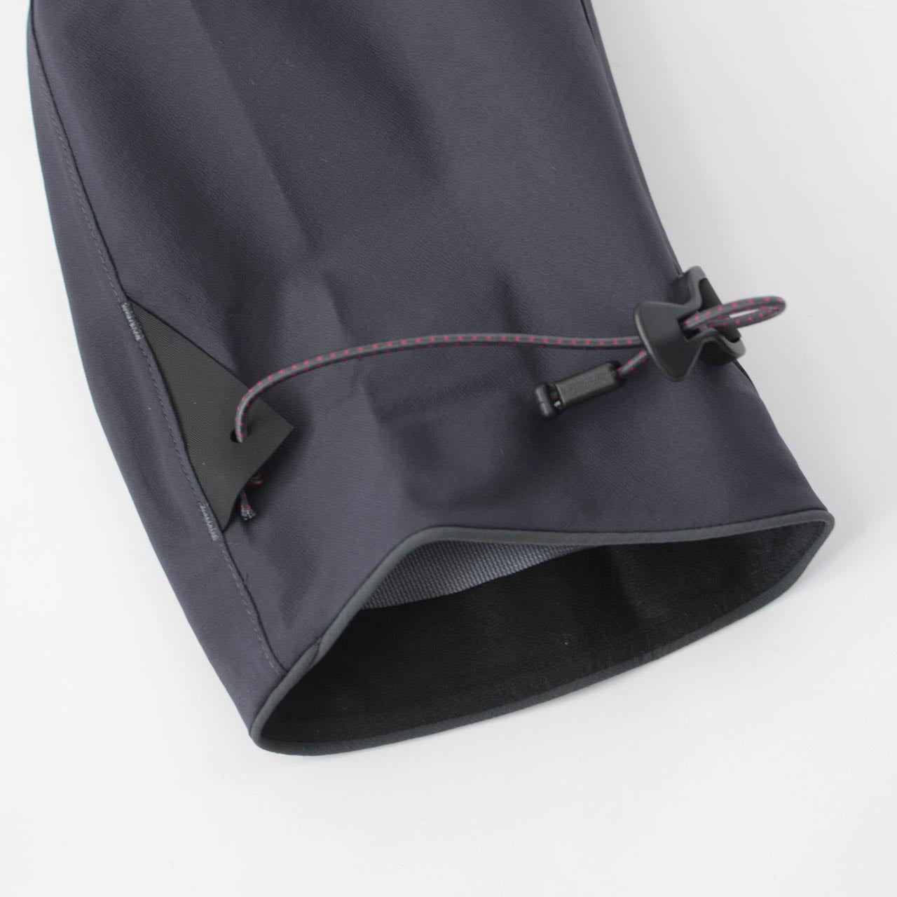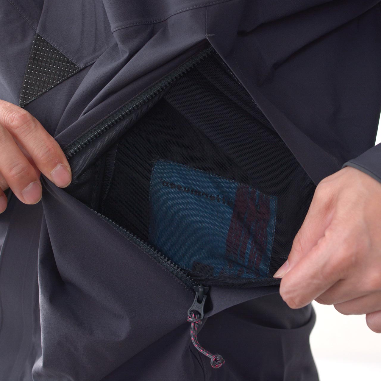 バックパックやハーネスの使用を考えて高い位置に配置されたメッシュポケットを配しています。