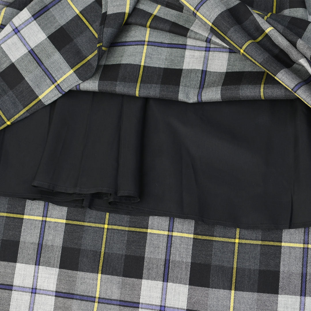 クラシカルなチェック柄に、胸下からふわりと広がるフレアシルエットが映えます。