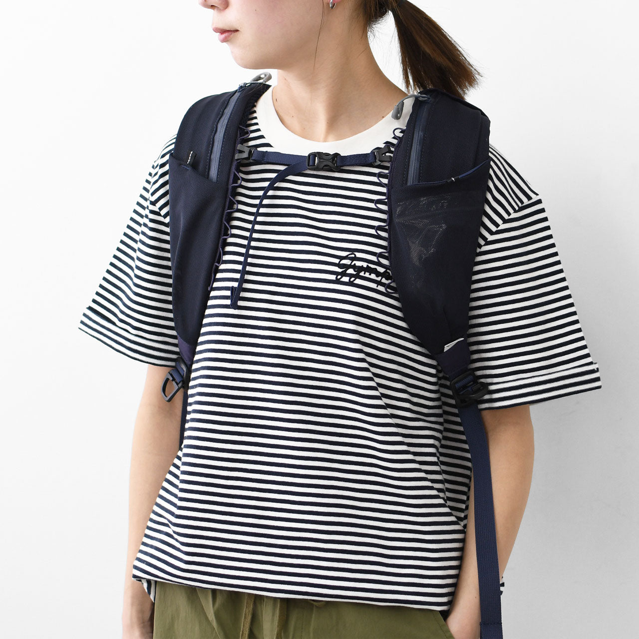 ・ショルダーハーネスには、スマホ・AirPods・ドリンクが収まる一体型ポケット付き。