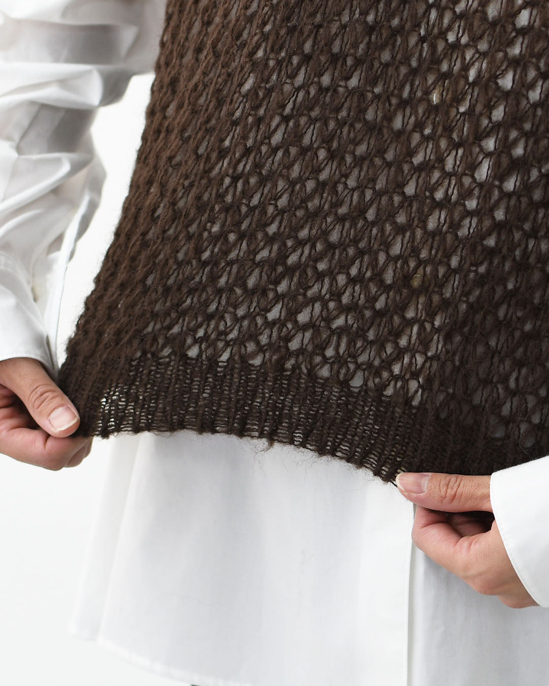 ざっくりとした編み目が透け感を生み、シャツやカットソーとのレイヤードが楽しめるデザイン。
